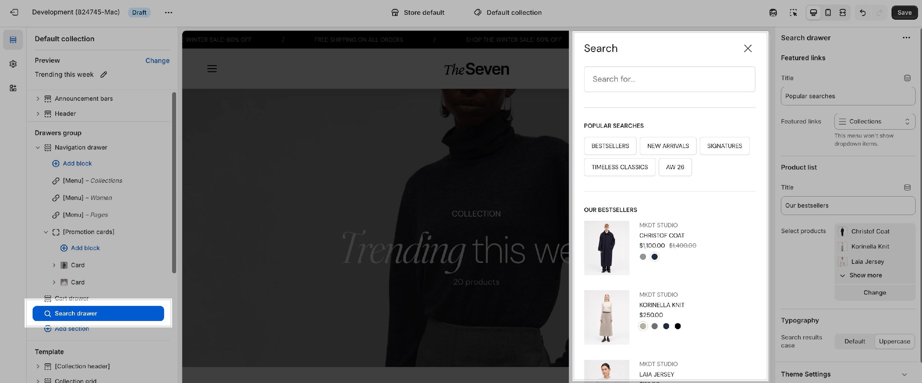 The Search drawer section is a sidebar that opens when the user opens search (e.g. from the header search icon). It contains a search form, live results, and optional featured links and bestsellers.