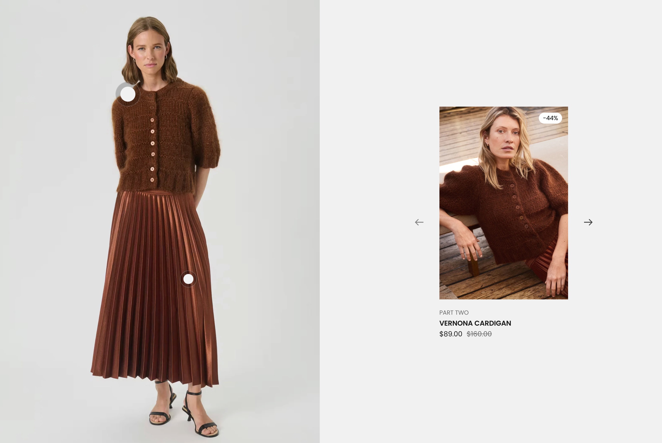 The Shop the look (product slider) section combines a styled image with hotspots and a linked product slider. Each hotspot maps to a product, and the slider shows product cards in the same order as the hotspots.